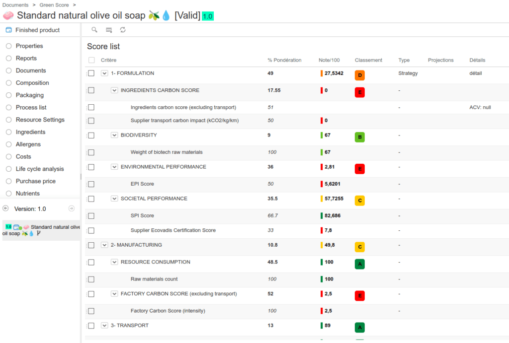 In beCPG, the structure follows a clear hierarchy, with parent criteria and sub-criteria, in line with the GII methodology. This evaluation is then available in “Score list” within the relevant product records.