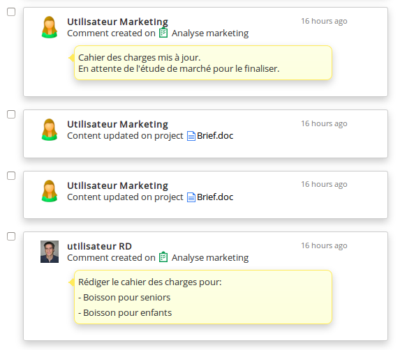 To follow the exchanges between client and suppliers, project actors are notified by email and a view shows the project activity:
