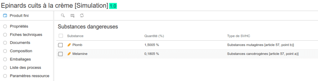 Dans beCPG, cette gestion est intégrée directement dans le modèle de données. Les substances peuvent être renseignées au niveau des matières premières comme des emballages avec leur type de danger, leur quantité et, si nécessaire, leur taux de migration vers le produit. Ces informations sont ensuite automatiquement consolidées au niveau du produit fini.