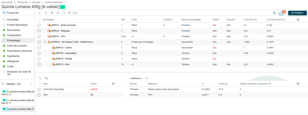 Dans beCPG, toutes les données packaging sont structurées et liées directement au produit : type d’emballage (primaire, secondaire, tertiaire), quantités, poids, matériaux ou encore coûts.